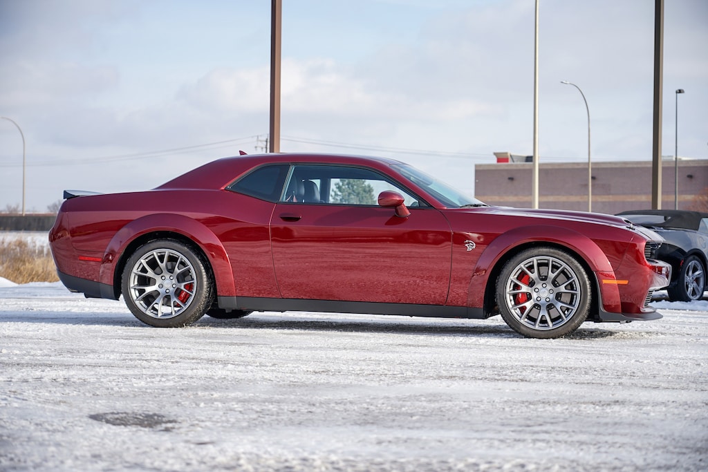 1-Yr SiriusXM Guardian Trial, 220 MPH Primary Speedometer, 4-Wheel Disc Brakes, 4G LTE Wi-Fi Hot Spot, 6 Speakers, 8.4" Touchscreen Display, ABS brakes, Adaptive suspension, Air Conditioning, Alloy wheels, AM/FM radio: SiriusXM, Anti-whiplash front head restraints, Apple CarPlay, Apple CarPlay/Android Auto, Auto-dimming Rear-View mirror, Automatic temperature control, Black Seat Belts, Blind Spot & Cross Path Detection, Body Color Exterior Mirrors, Brake assist, Bumpers: body-color, Carbon Dual Stripe, Compass, Compass Gauge, Delay-off headlights, Demonic Red Seat Belts, Driver Convenience Group, Driver door bin, Driver vanity mirror, Dual front impact airbags, Dual front side impact airbags, Electronic Stability Control, Emergency communication system: SiriusXM Guardian, Exterior Mirrors w/Heating Element, For Details, Visit DriveUconnect.com, For More Info, Call 800-643-2112, Four wheel independent suspension, Front anti-roll bar, Front Bucket Seats, Front Center Armrest, Front dual zone A/C, Front reading lights, Fully automatic headlights, Garage door transmitter, Google Android Auto, GPS Antenna Input, HD Radio, Heated door mirrors, Heated Front Seats, Heated front seats, Heated Steering Wheel, Heated steering wheel, High Performance Engine Controller, High-Intensity Discharge Headlamps, Illuminated entry, Integrated Center Stack Radio, Integrated Voice Command w/Bluetooth, Jailbreak IP Badge, Leather Shift Knob, Low tire pressure warning, Media Hub (2 USB, AUX), MOPAR Black Hood Pin Kit, Outside temperature display, Overhead airbag, Overhead console, Panic alarm, ParkView Rear Back-Up Camera, Passenger door bin, Passenger vanity mirror, Power door mirrors, Power driver seat, Power Multi-Function Foldaway Mirrors, Power steering, Power windows, Quick Order Pkg 27D Hellcat Redeye Widebody Jailbreak (DISC), Radio data system, Radio: Uconnect 4C w/8.4" Display, Real Carbon Fiber Interior Accents, Rear anti-roll bar, Rear reading lights, Rear seat center armrest, Rear window defroster, Red Floor Mat Binding, Red LED Alcantara Steering Wheel, Redeye Badging, Remote keyless entry, Satin Chrome Exterior Badges (DISC), Security system, Shark Fin Antenna, SiriusXM Radio Service, SiriusXM Satellite Radio, Speed control, Speed-sensing steering, Split folding rear seat, Spoiler, Sport steering wheel, SRT Hellcat Logo Houndstooth Seats, SRT Power Chiller, Steering wheel mounted audio controls, Suede Headliner, Tachometer, Telescoping steering wheel, Tilt steering wheel, Traction control, Trip computer, USB Host Flip, Variably intermittent wipers, Wheels: 20" x 11.0" Carbon Black Lightweight, Widebody Competition Suspension, Widebody Fender Flares.